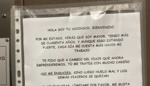"Hola, soy tu ascensor. Bienvenido", asegura el cartel. "Por mi estado, verás que soy mayor. Tengo más de 40 años, y aunque sigo estando fuerte, cada día me cuesta más hacer mi trabajo. Te pido que a cambio del viaje que ahora emprenderemos, tú me trates con mucho cariño", continúa el mensaje.