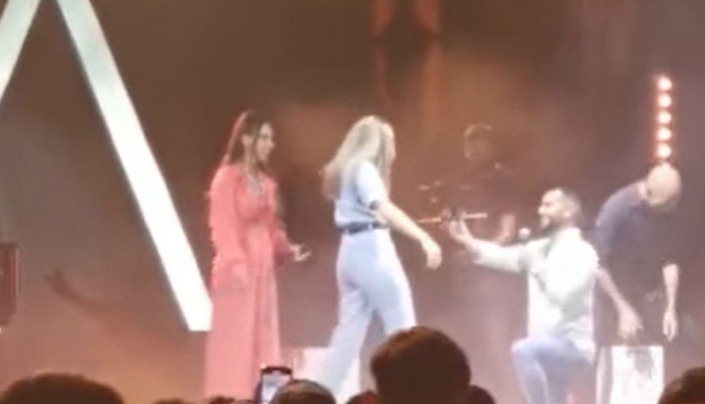 Con la voz de India Martínez de fondo entonando los versos del tema 90 minutos, el hombre no dudó en mostrar un anillo a su pareja, que le mirada conteniendo las lágrimas. Después, se fundieron en un largo abrazo mientras el público aplaudía. La pareja terminó la canción cantando con la artista que fue testigo de la pedida con alegría.