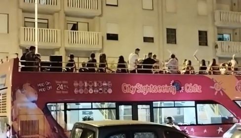 Otro usuario ha podido inmortalizar el momento en el que varias personas se encuentran bailando en el techo del vehículo por las calles de Cádiz mientras suena música con un volumen elevado. El vídeo ya ha recibido numerosas críticas.