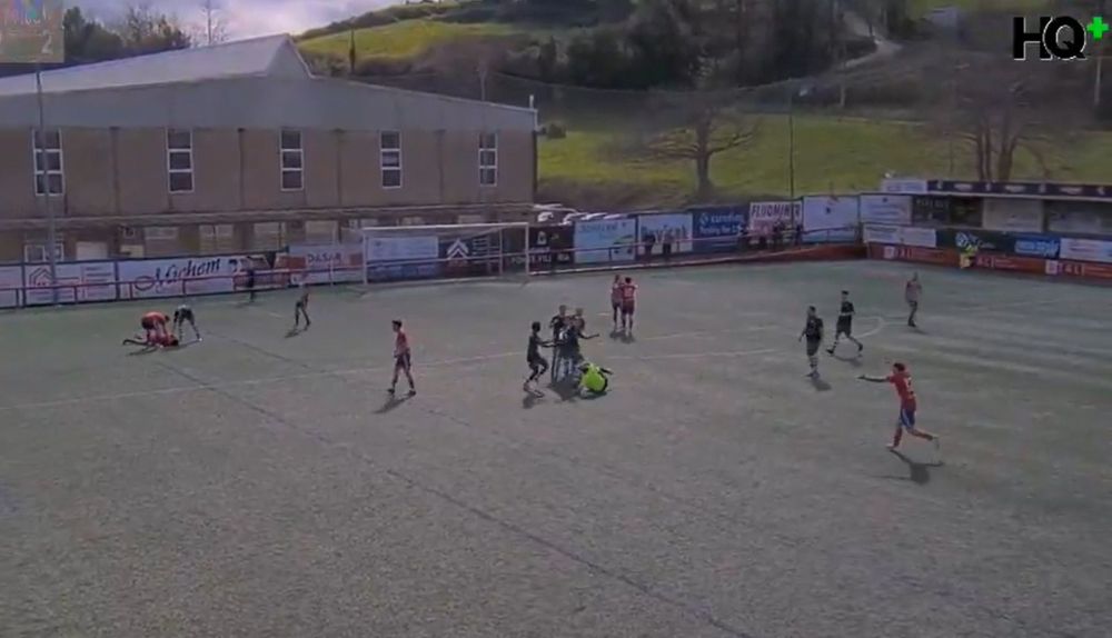 El árbitro pita un penalti a favor del Llanera B y el jugador que comete el penalti se va a por el árbitro, dándole un bofetón, agarrándole de la cabeza y tirándole al suelo