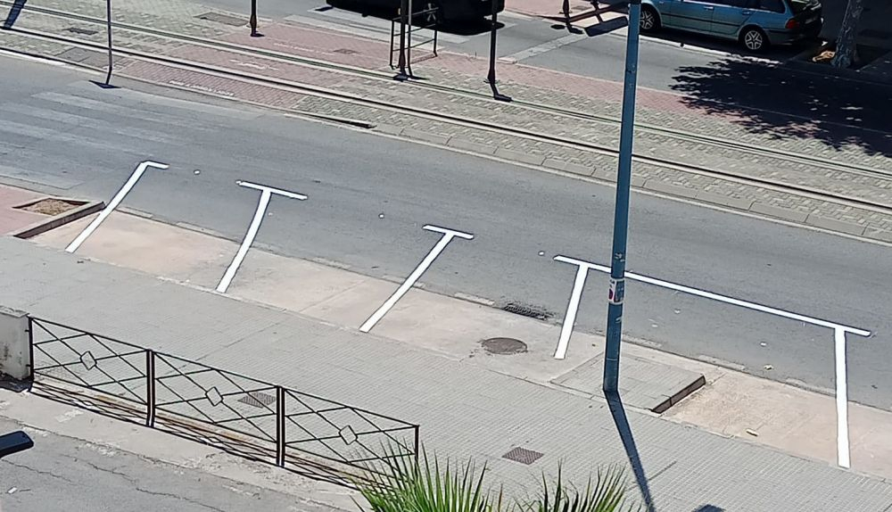 La línea pintada a una distancia diferente al resto provoca que el espacio para los coches sea menor. "Imposible pintarla derecha con este levante", ríe una persona.