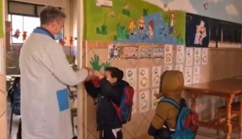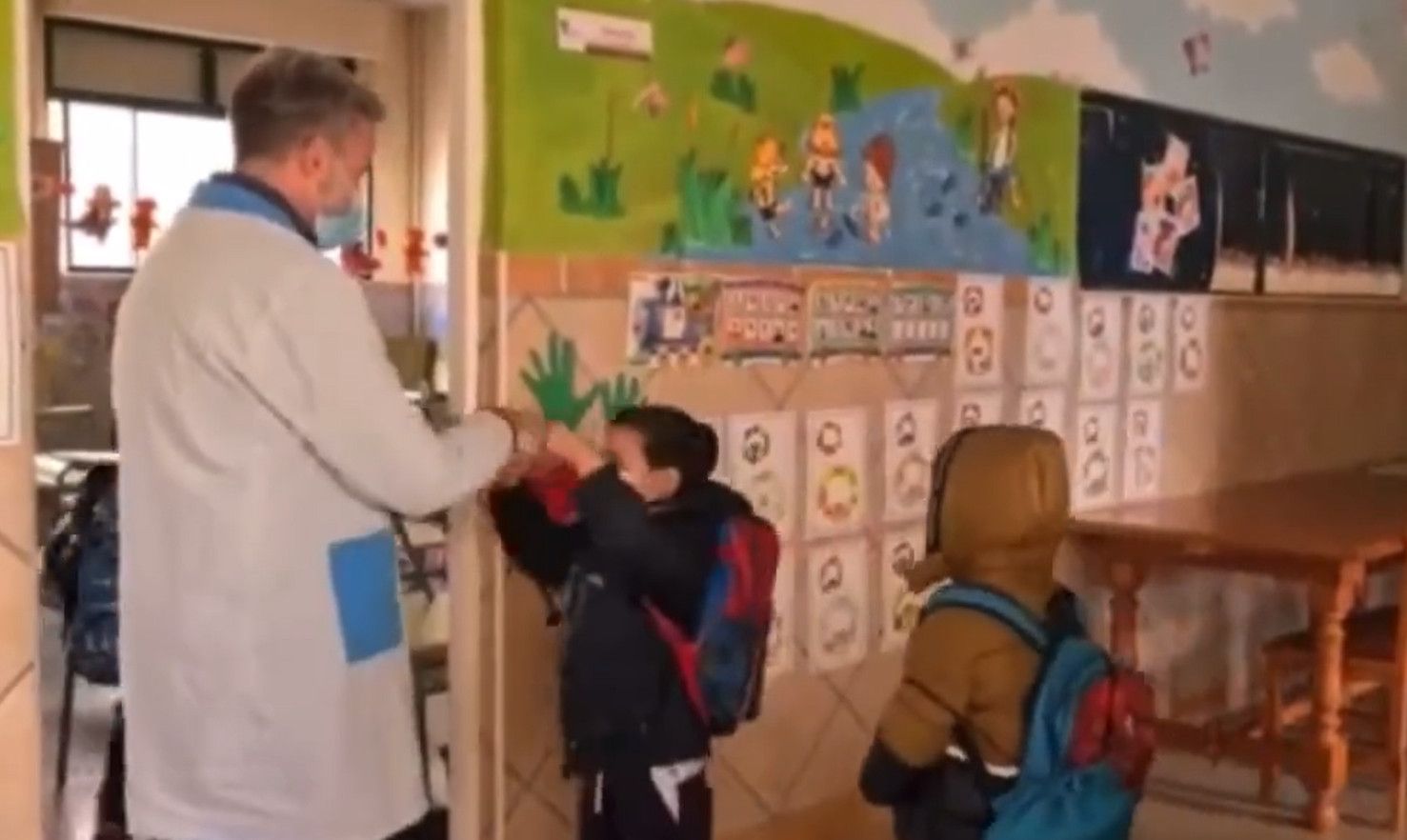 El docente se coloca en la entrada del aula para recibir con una sonrisa en la cara a los pequeños. Para ello, les anima a participar en un juego en el que los escolares pueden elegir el tipo de saludo que quieren recibir. Un divertido baile, un choque de puños o un abrazo. Tan solo tiene que tocar las figuras de cartulina dispuestas en la pared y Enrique procederá a ello.