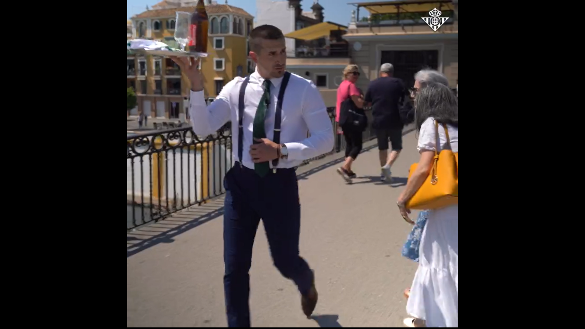 Un camarero recorre diferentes puntos de Sevilla con una bandeja y un litro de Cruzcampo mientras saluda a todo el que se cruza hasta llegar al estadio Benito Villamarín. Allí sirve una copa a Romain Perraud. Ha sido la forma que el Real Betis ha elegido para anunciar a su primer fichaje de la temporada.