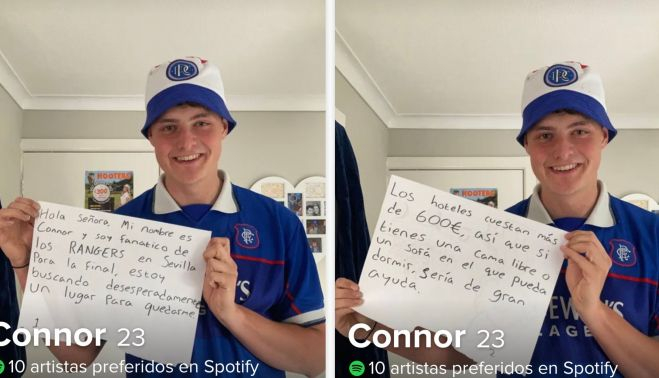 Los apartamentos y hoteles se han encarecido muchísimo para el 18 de mayo en Sevilla, donde se juega la final de la Europa League entre el Eintracht de Frankfurt y el Rangers. Sin embargo, hay fanáticos que no persisten en el intentó de viajar el a la capital andaluza para ver a su equipo jugar. Es el caso de Connor, el joven de 23 años hincha de los Rangers que ha utilizado su ingenio y está intentando buscar un sitio para quedarse a través de Tinder, una aplicación de citas.