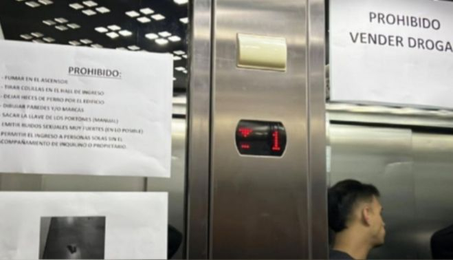 Tres carteles en el ascensor avisan de dichas normas, que van desde la prohibición de vender drogas o fumar en el ascensor, a no tirar colillas en el hall de ingreso al edificio.
