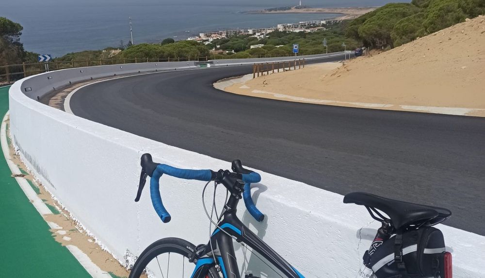 La fotografía lleva ya más de 2.000 'me gusta' y no es para menos. En ella se observa una espectacular curva en la que aparece el carril bici que llega a Los Caños de Meca desde Barbate con una bicleta apoyada. Sin embargo, los más espectacular es lo que se observa al fondo. Alguno de los edificios que componen este núcleo acompañan la forma del litoral gaditano con un imponente faro de Trafalgar al final de la imagen.
