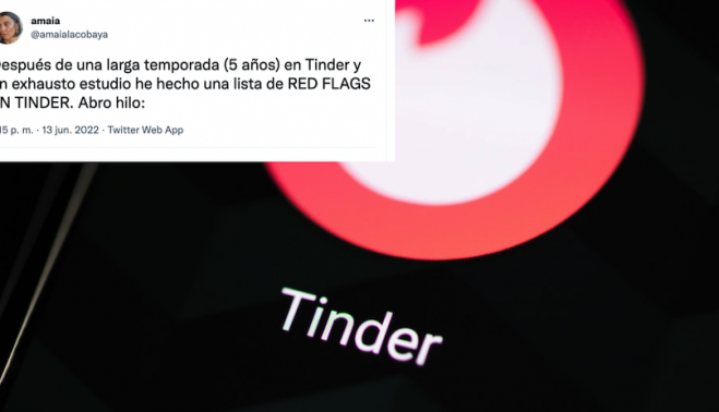 "Después de una larga temporada (cinco años) en Tinder y un exhausto estudio he hecho una lista de red flags en Tinder", comienza la usuaria @amaialacobaya un hilo de Twitter que, cuando se escriben estas líneas, supera los 5.000 retuits y se acerca a los 20.000 me gusta.