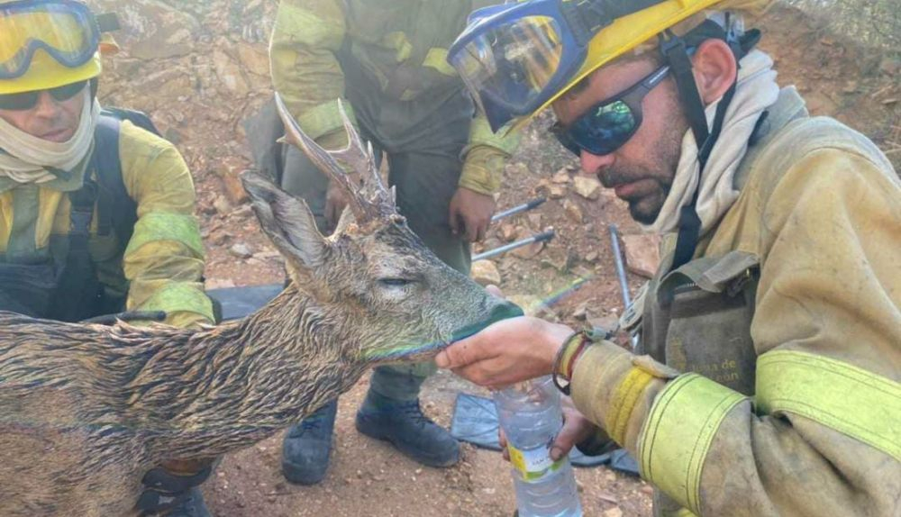 Los bomberos forestales de Castilla y León rescataron a una cría de cérvido afectada por las altas temperaturas y el fuego, a la que no dudaron en hidratar con una botella de agua. La imagen es tan dura como enternecedora. En el vídeo puede advertirse cómo el pequeño animal bebe con ahínco y disfruta de los tragos de agua ante la atenta mirada de los forestales.