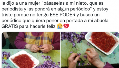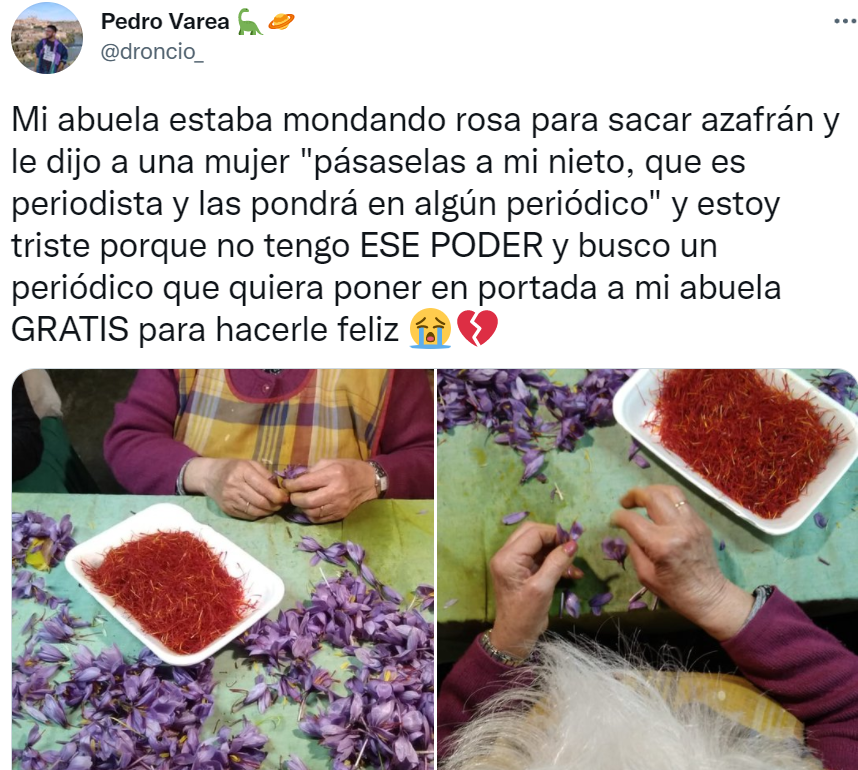 Hace una semana, Pedro Varea, un periodista colaborador de El Salto, contaba la historia de su abuela. La mujer, mondaba rosas para sacar el azafrán desde hace muchos años y quería que su nieto la sacase en el periódico. “Mi abuela estaba mondando rosa para sacar azafrán y le dijo a una mujer ‘pásaselas a mi nieto, que es periodista y las pondrá en algún periódico' y estoy triste porque no tengo ese poder y busco un periódico que quiera poner en portada a mi abuela gratis’ para hacerle feliz”, contaba el periodista.