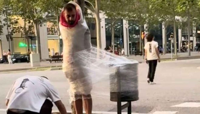 Una llamativa despedida de soltero en Barcelona ha llamado la atención tanto de viandantes como de usuarios en redes sociales, donde el vídeo del momento se ha difundido rápidamente. En él, puede verse al protagonista del festejo –el futuro esposo— disfrazado de satisfyer y completamente envuelto en film transparente, atado a un árbol en una zona de paso muy transitada. La escena ha generado tanto risas como sorpresa entre quienes la presenciaron en directo.