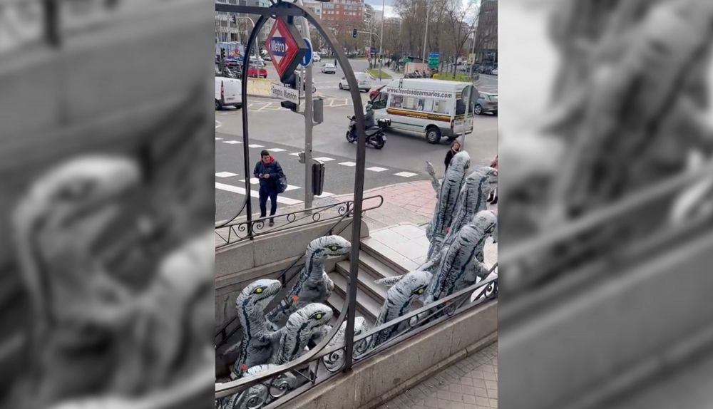 El podcaster Francisco Izuzquiza grabó cómo más de una decena de personas disfrazas de dinosaurios hinchables se agolparon en la esquina de la calle José Abascal con el Paseo de la Castellana, en pleno centro, tras salir de la boca de la parada de metro Gregorio Marañón. Inquietos esperaron a que el semáforo se pusiera en verde para los peatones y, sin dudarlo, unidos, cruzaron por el paso de cebra.