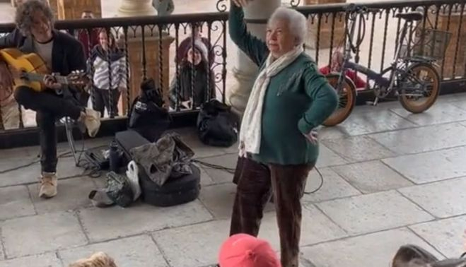 Entre las miradas de los turistas y algún visitante local, esta mujer dio cuenta de su arte hasta el punto de llegar a eclipsar durante una sevillana a la bailaora que estaba ofreciendo su espectáculo. El vídeo está cerca de llegar al millón de visitas.
