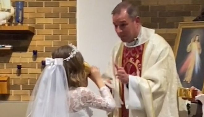 El sacerdote de la iglesia católica Risen Savior de Brandon no esperaba que la pequeña fuese a ingerir de un trago esta bebida, tal y como se percibe en su cara de asombro grabada por la madre. Un vídeo publicado en Tik Tok que se ha hecho viral con rapidez.