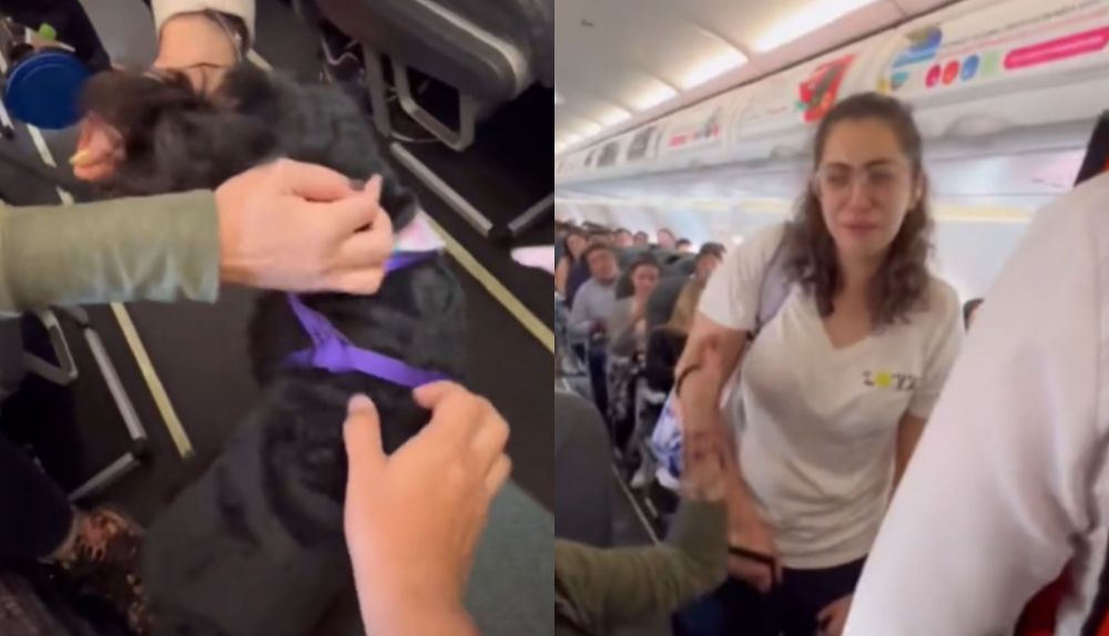El vídeo, que se ha viralizado un vídeo a través de TikTok, muestra a una mujer llorando porque tiene que abandonar el avión. El motivo es que su perro de apoyo se puso estresó mucho y se le cayó el bozal. "No se lo pudo poner porque el perrito se puso muy nervioso", relata el joven que viaja en el avión y graba los hechos.