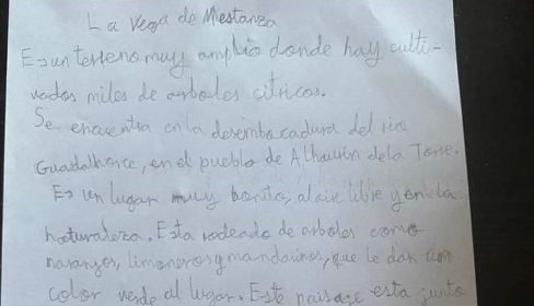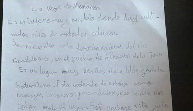 “Es un lugar muy bonito al aire libre y en la naturaleza. Está rodeado de árboles como naranjos, limoneros y mandarinos que le da color verde al lugar. Este paisaje está junto al río, donde puedes ver tortugas, peces y nutrias nadando. En los árboles puedes encontrar camaleones”, describía el niño en una carta publicada por el Twitter de La Vega de Mestanza.