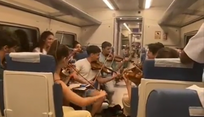 Ocho jóvenes andaluces que viajaban hasta casa después de participar en las pruebas de cuerda y percusión de la Orquesta Joven de Andalucía sacaron sus violines. En unos minutos el tren se convirtió en un teatro y la música remplazó los momentos de ansiedad que se vivía.