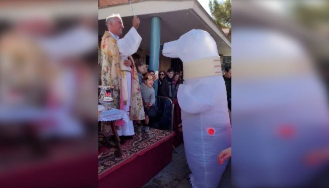 Tras el agua bendita, el párroco le da un abrazo a este divertido oso que se ha convertido ya en todo un icono. "¡Qué arte más grande!" han apuntado en redes sobre la bendición y presencia de este personaje en Sevilla.