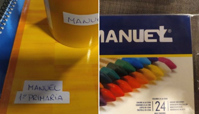 La vuelta al cole trae consigo largas tardes de forrar libros, recargar los estuches o etiquetar el material escolar. Los padres se esmeran para que a sus hijos no les falte de nada y, sobre todo, para que no lo pierdan. Pero cada persona lo hace de la forma que mejor le parece. Al marido de una usuaria de Twitter se le ha ocurrido una idea original que ha causado furor en las redes.