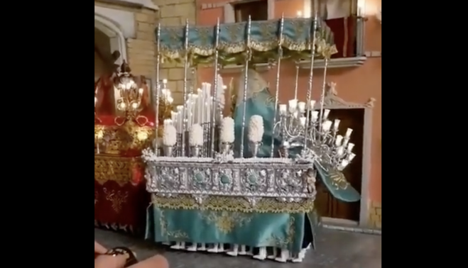 Resulta divertido ver cómo avanza despacio pero sin cesar. Tan realista es que incluso el mantón y las luces se mueven al son de los pasos y de la marcha que, como no podía ser de otra forma, acompaña esta curiosa performance.