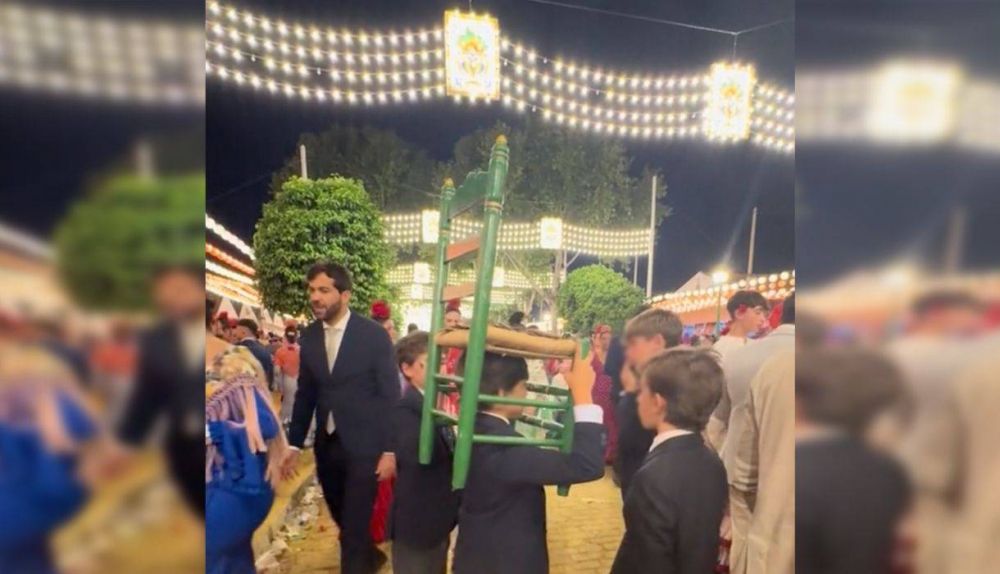 Utilizando una silla como paso, tres jóvenes han montado su particular Semana Santa en la Feria de Abril. Este es el rebujito que nunca falla en la capital hispalense, el de la fusión entre las dos grandes fiestas de la ciudad.