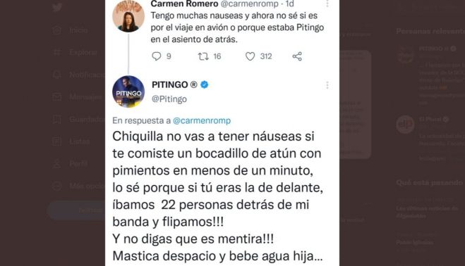 "Tengo muchas náuseas y ahora no sé si es por el viaje en avión o porque estaba Pitingo en el asiento de atrás", tuiteó Carmen Romero. Pitingo, lejos de quedarse al margen del comentario, decidió responder con rotunda sinceridad: "Chiquilla no vas a tener náuseas, si te comiste un bocadillo de atún con pimientos en menos de un minuto, lo sé porque si tú eras la de delante, íbamos 22 personas detrás de mi banda y flipamos. Y no digas que es mentira!! Mastica, despacio y bebe agua hija, se te pasará":