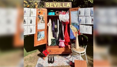 Las costumbres y tradiciones de Sevilla representadas en una imagen de una boda que se ha convertido en viral en redes. Un ropero de los de antes, con trajes de flamenca y túnicas de nazareno en su interior, servía como soporte en sus puertas para colocar la lista de invitados del enlace.