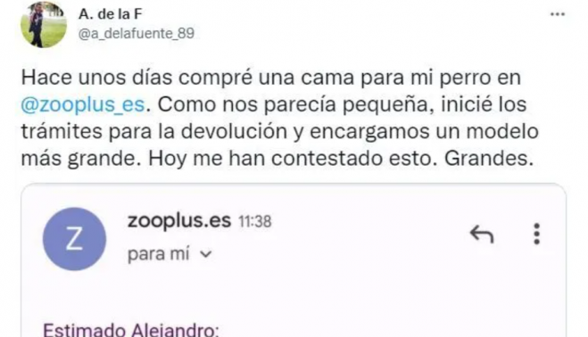 “Hace unos días compré una cama para mi perro en @zooplus_es. Como nos parecía pequeña, inicié los trámites para la devolución y encargamos un modelo más grande. Hoy me han contestado esto. Grandes”, escribía en su red social y adjuntaba una imagen de la respuesta.