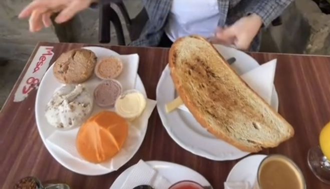 En uno de sus últimos vídeos ha mostrado un desayuno muy completo. En concreto, un pan de pueblo acompañado de "unos manjares de Dios", es decir, paté de hígado, zurrapa de lomo, manteca coloro, paté de jamón york, mantequilla, salmorejo y tomate unido a un café y un zumo de naranja. "Esto lo podemos llamar brunch, cena y todo lo que quieras porque yo ya he comido en todo el día", bromea antes de probar los diferentes acompañamientos. El pan, por su parte, es el doble de la palma de la mano. "Aquí no preguntan lo que quieres con la tostada, aquí te lo traen".