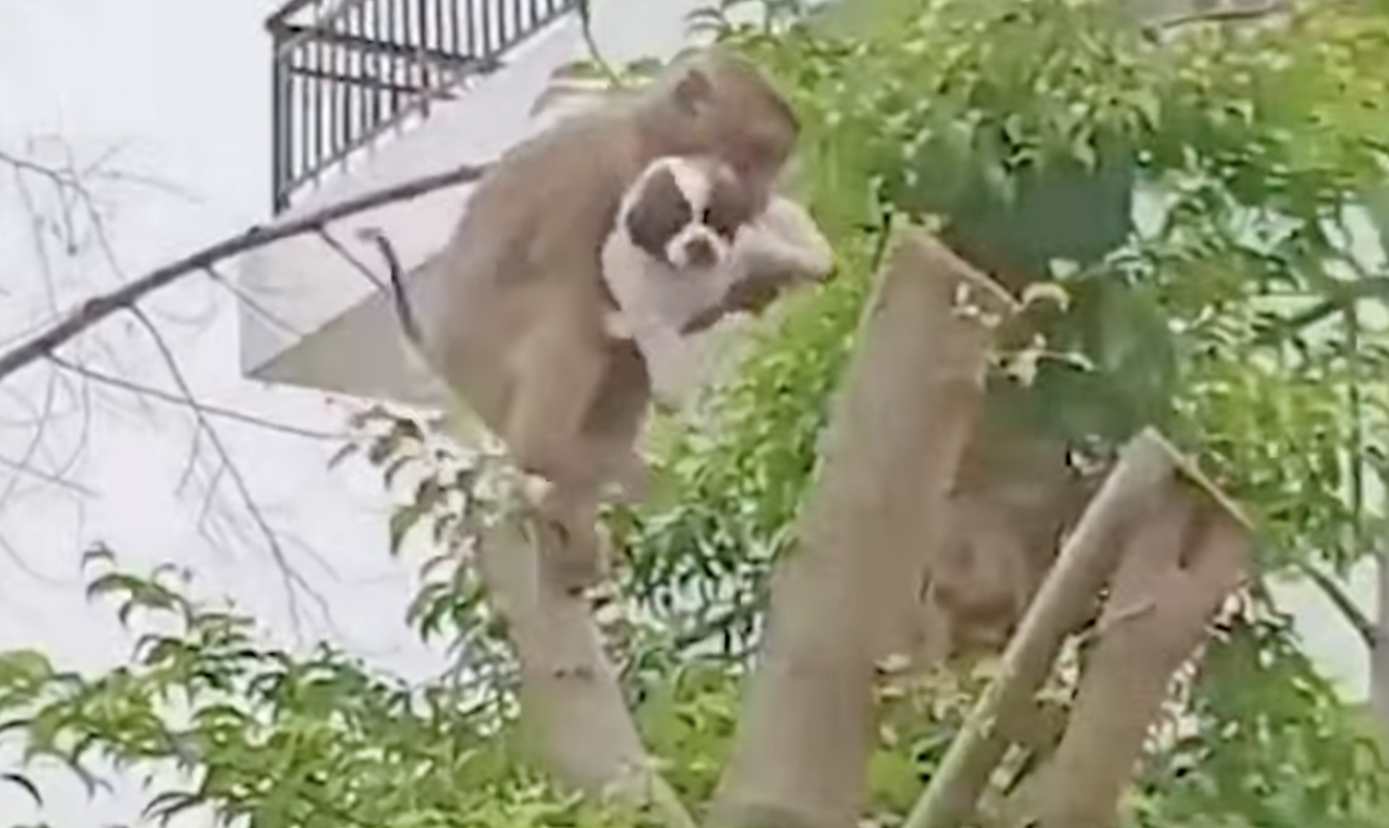 Insólita escena que se ha viralizado rápidamente en redes sociales. Un mono capuchino ha protagonizado un episodio de lo más curioso tras robar un perro pequeño y llevárselo entre sus brazos por las ramas de los árboles.