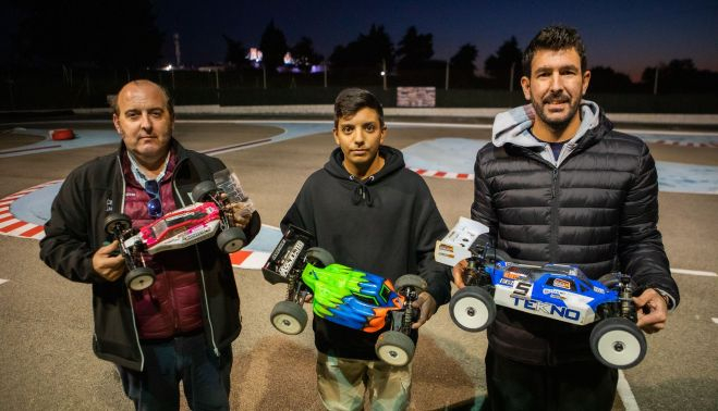 Al lado de los veteranos Juan Luis y Manuel, el portuense Iván Fernández coloca con cuidado su coche eléctrico. El joven de 20 años, auxiliar de enfermería, se interesó por este universo desde que sus padres le regalaron un coche.