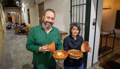 Mientras que en el interior, Alboronía alberga un acogedor salón reformado con las acuarelas del pintor Jaime Pandelet —padre de Adelina—, la nueva terraza de la calle Gibraleón es un must tanto a mediodía como por las noches. En una de las mesas exteriores, Víctor y Adelina sirven una alboronía y un tajine de pollo. "Son los clásicos, los que no hemos quitado de la carta y nunca fallan". dicen. Así es: el que va, repite.