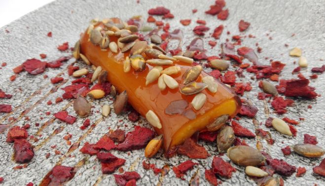 La prueba de que algo se mueve en la gastronomía roteña lo encontramos en las tres tapas de Utopía y Capicua que entran en concurso. Principalmente, un canelón frío de calabaza y tintilla de Rota que lo tiene todo. Imaginación, ejecución, gusto, técnica, color y sabor. Es otra de las tapas premiadas. Juanto al dulce de la calabaza y la tintilla tienen sentido el toque salado de las pipas de calabaza y de girasol y las remolacha frita. Un resultado brillantísimo de quien se ha criado en la escuela de Ángel León. Aquí hay presente y mucho futuro.
