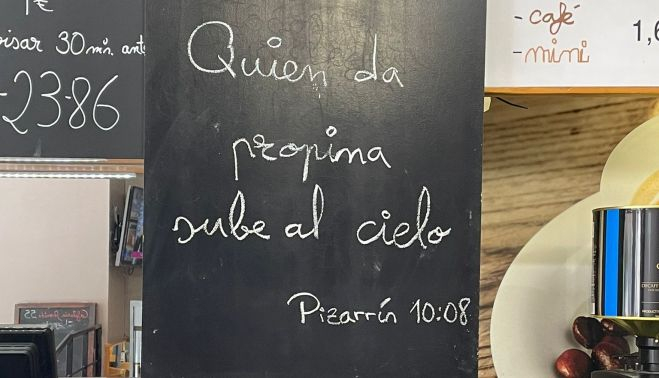 Alberto cada día intenta darle una vuelta de tuerca a esa ironía de bar del "hoy no se fía, mañana sí". En una pizarra que tiene encima del mostrador coloca cada mañana una frase especial, un vacile o indirecta a los clientes. La de esta mañana era: Quien da propina sube al cielo. "Después de todo lo que hemos sufrido este último año y medio tenemos que darle la vuelta a la tortilla y reinventarnos. Hay que reírse y pasarlo bien. Si alguien no lo entiende, no pasa nada, hay más de un millón de bares en España. Aquí somos una gran familia".
