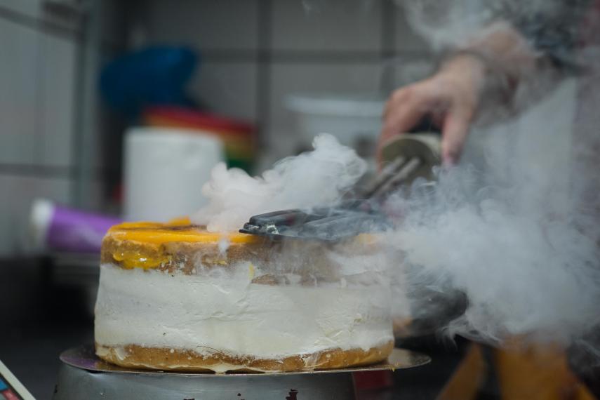 Con cerca de tres pisos, rellena de chocolate y nata, Juan José coge una espátula y echa unos buenos pegotes de yema pastelera. "Es una máquina. Aquí es el brazo ejecutor", expresa Juan Carlos Ibáñez, el dueño de Berlín Café (Avenida José Manuel Caballero Bonald), mientras su compañero coge una plancha caliente para darle el toque tostado a la tarta San Marcos. Ibáñez es toda una institución en el mundo repostero y uno de los pocos maestros chocolateros de la provincia. En agosto de este año su bebé, su primera cafetería pastelería, cumplirá cuatro años desde que abrió sus puertas por primera vez el 2 de agosto de 2013. No obstante, este jerezano no ha dejado de endulzar estómagos desde que dejó el colegio con tan solo 13 años para aprender el arte de la pastelería en el negocio familiar.