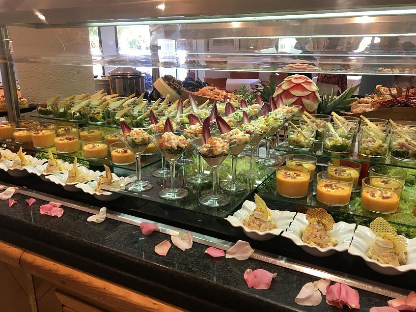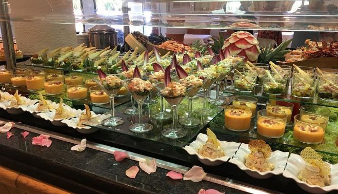 El buffet incluye todo tipo de canapés, embutidos y entrantes como salmorejos, tartar de atún, pastel de pescado o ensaladillas. Además, habrá fuentes con marisco cocido, entre los que se incluyen cigalas, patas rusas, gambas y langostinos, así como verduras, pimientos fritos, coliflores y platos de arroz negro y de arroz ibérico.