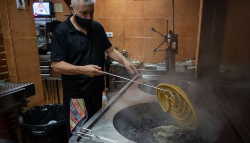 Mientras que nuestro fotógrafo Manu García degusta el caviar del Cazador –"están buenísimos" asegura con una sonrisa de oreja a oreja– nos entra la curiosidad de saber cuántos kilos de churros hacen a diario en tan emblemático bar. "La verdad es que no lo sabemos –nos indica Paco–. Lo hacemos a ojo de buen cubero, con unas medidas particulares que nos enseñaron una vez. Hacemos masa de 3, 4, 5 y 6. Entre semana hacemos una masa de 4 y los domingos hacemos cuatro masas de 5 y una de 3. Nunca los hemos pesado por kilos, pero es cierto que hacemos un montón".