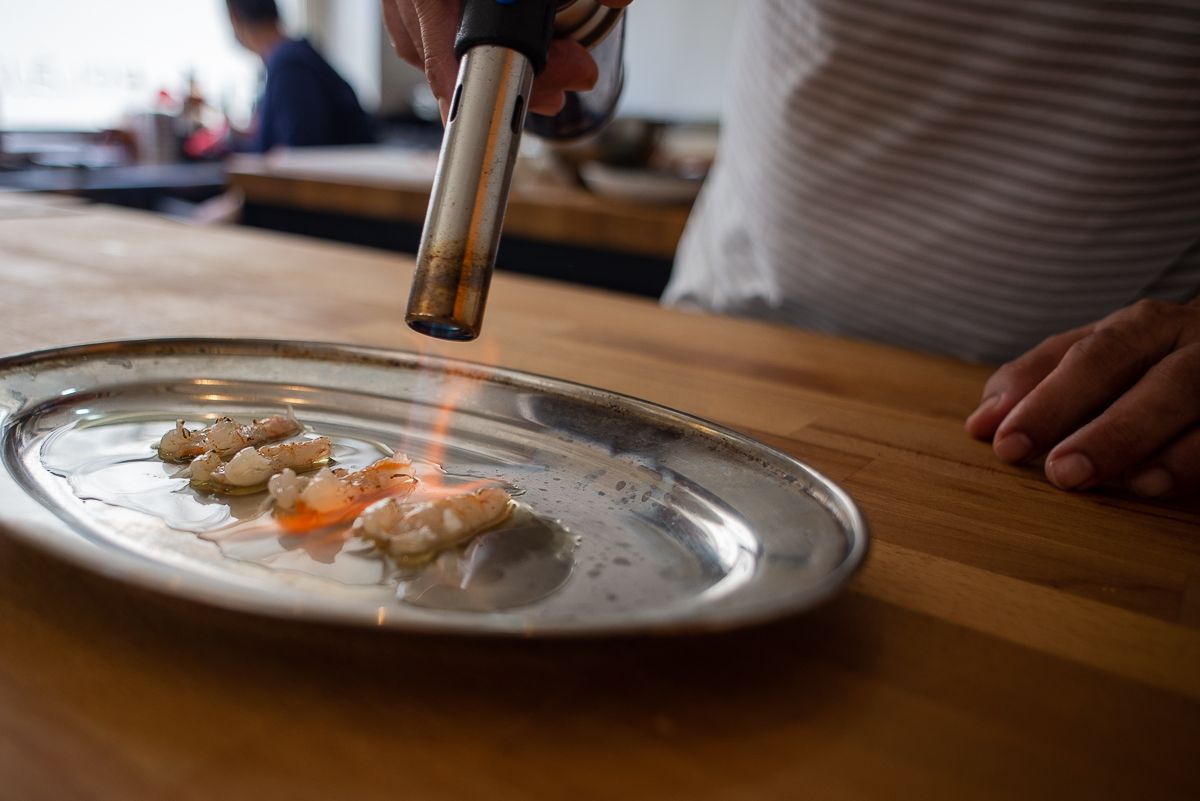Entre las opciones de temporada destacan las coquinas de fango, como él dice, “la hermana pobre de las almejas”, que cocina a la marinera, pero con unos toques asiáticos, salsa thai hecha a base de leche de coco y lima. También menciona los langostinos a la brasa que se cogen en la zona de la Bahía. “Son más pequeñitos que los de Sanlúcar, pero los hacemos a la brasa y están de lujo”, asegura Miguel que se dispone a meterse en la cocina. “Son pescados fritos que tienen su elaboración”, añade valorando el de los esteros de verdad “no el que se le echa pienso, el de verdad muy pocas personas lo comen”.