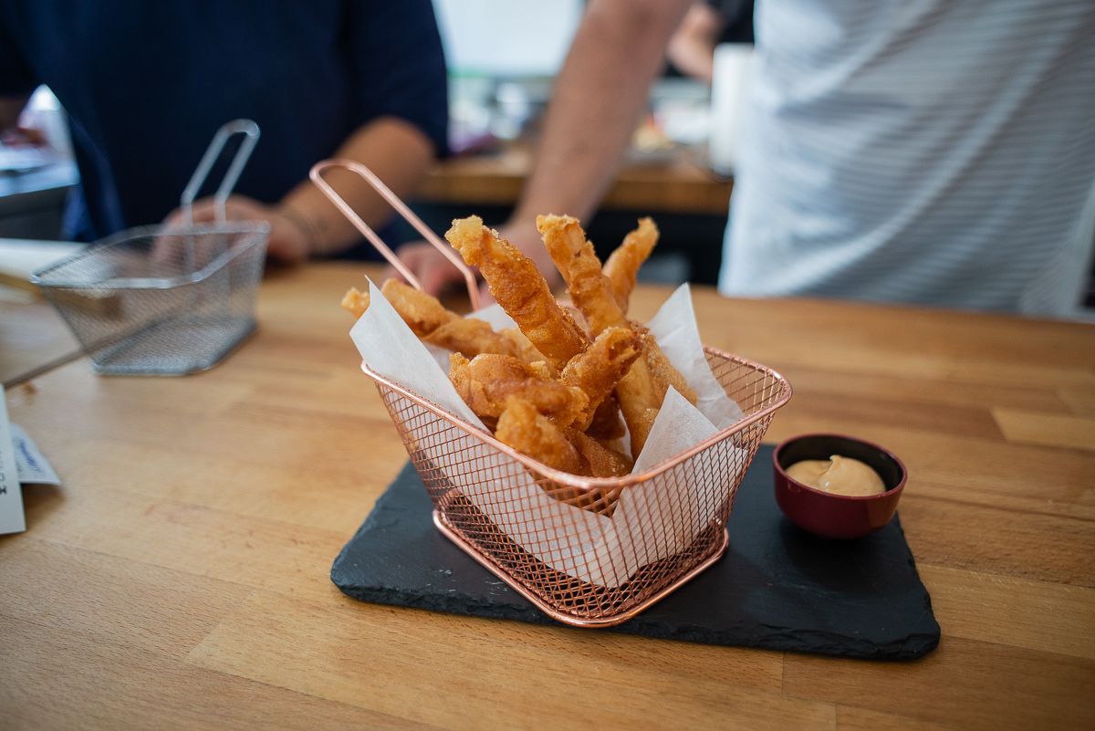 Un taco mejicano de pavía de albur de esteros –“lo fileteo, le paso una tempura y la monto”- los bocatas de calamares o los buñuelos de gambas al ajillo son algunas de ellas. Su propuesta más demandada por los comensales son los churros de gallo. Miguel detalla paso a paso la elaboración de esta “tapa estrella” que deja un buen sabor de boca. “Cogemos el gallo frito, lo trabajamos, lo cortamos en tiritas y lo liamos en una pasta, al freírlo parece un churro”, dice.