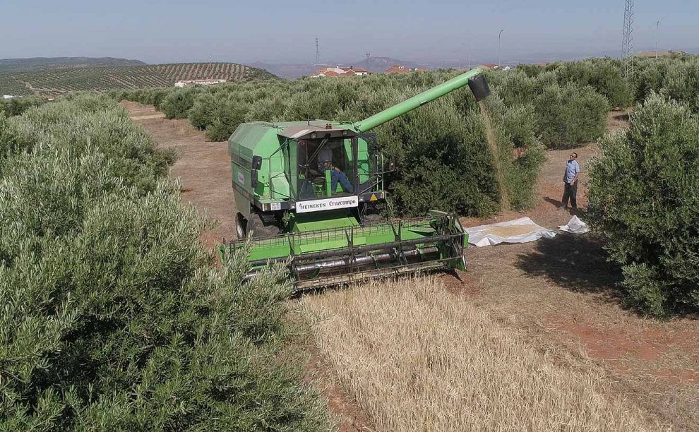 Cebada cultivada entre olivos de Jaén. FOTO: HEINEKEN.