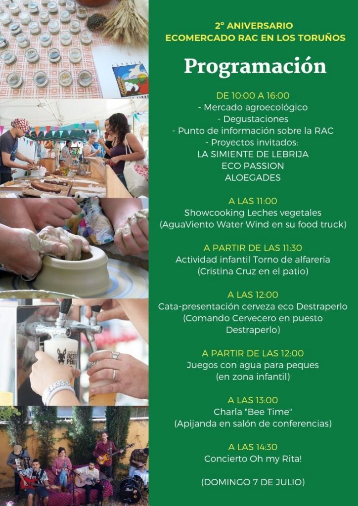 - De 10:00 a 16:00 horas: Mercado agroecológicos, degustaciones, punto de información de la RAC, Proyectos invitados: Ecopassion (empresa de productos zero plásticos), Aloegades (productores de Aloe Vera de Bornos) y La Simiente (Asociación que promueve el intercambio y conservación de semillas campesinas locales).
