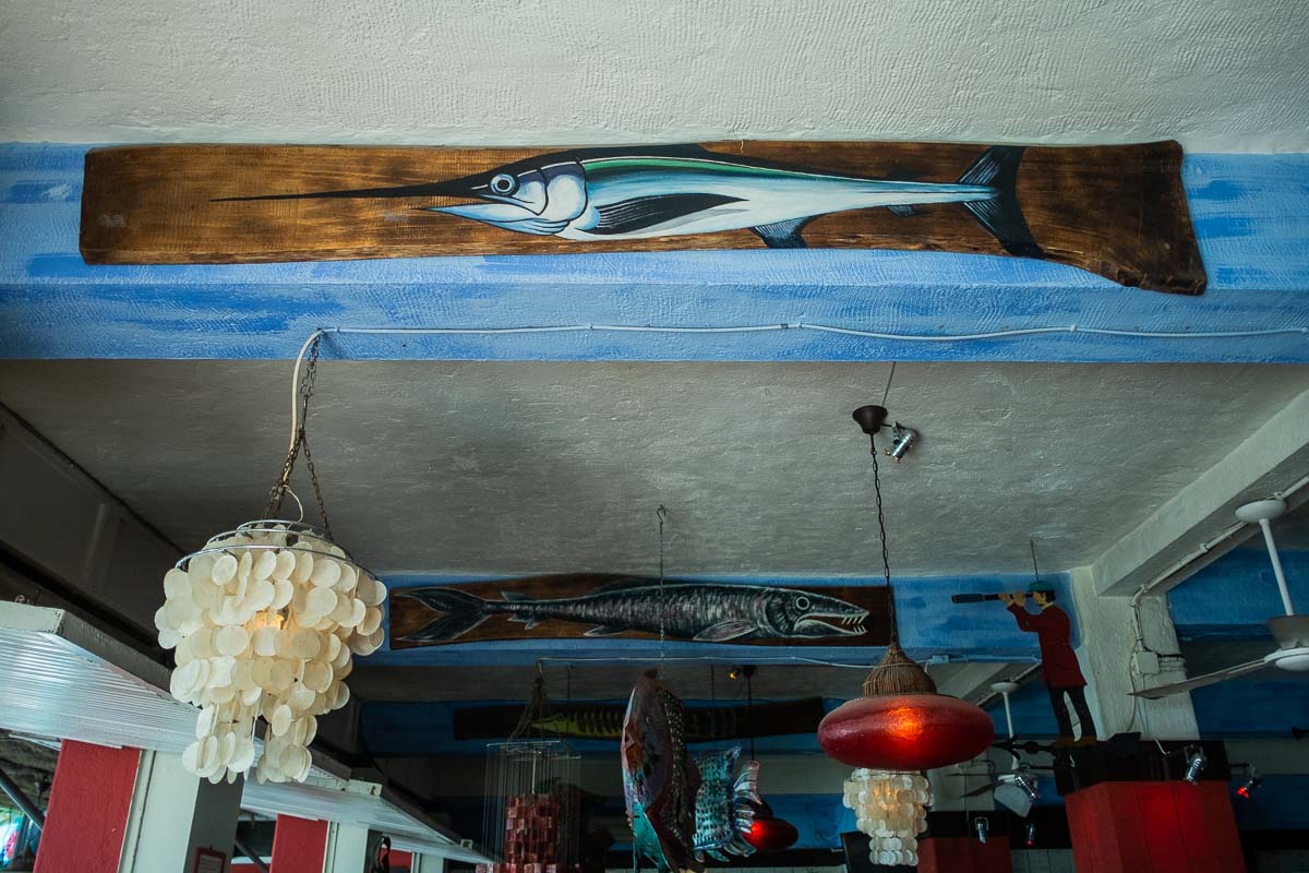 Los Montoya reformaron el local, que “estaba fatal”, dándole una “estética diferente y hippie” que encandila a cualquiera que entre en su interior. Madera, peces de colores que cuelgan del techo, sirenas y caracolas son los motivos que adornan este rincón que se mantiene tal y como se preparó, salvo “algunos cuadros que se deterioraron por el mar”.