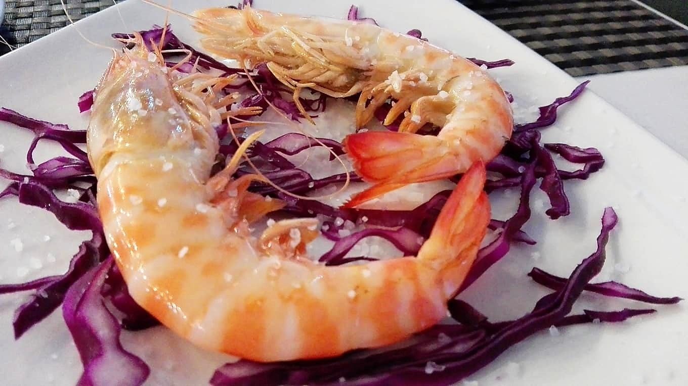 De entrante nos sirven unos saquitos de queso con miel de naranja que no logro ver en la carta. Están bien fritos y escurrido el aceite. Agradable el interior con el queso blanco, el crujiente y la combinación con el dulce de la miel. Un par de langostinos de considerable tamaño nos permite tomar contacto con el producto local. Están recién cocidos, frescos y con el punto de sal idóneo. Ligeros y sabrosísimos.