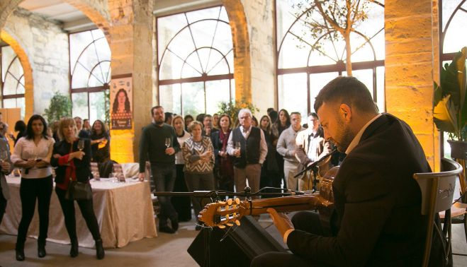 Arrancó el acto la guitarra de Pedro Espinosa, que interpretó tres piezas que sin embargo no contaron con el debido silencio de buena parte de los asistentes, quizás más pendientes del hambre que del arte. Ya sentados a la mesa, ejerció de maestro de ceremonias el embajador del Consejo de los vinos de Jerez en la gastronomía, Pepe Ferrer, que con maestría y agilidad, sin caer en la pesadez, fue presentando cada uno de los platos y explicando qué buscaban cada uno de los chefs a la hora de relacionarlos con los artistas que les tocaron en suerte.