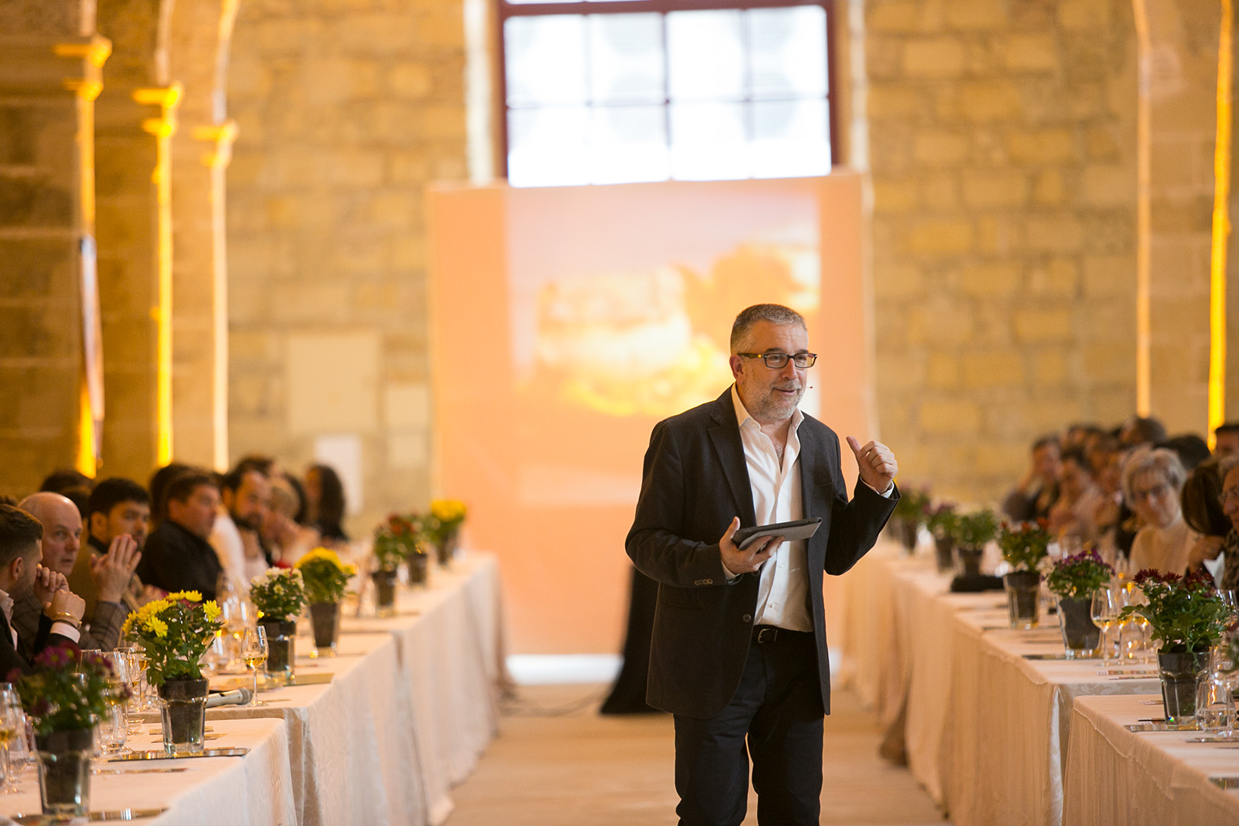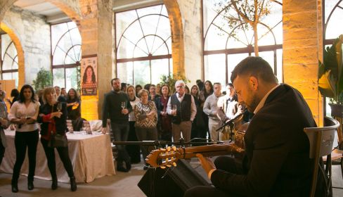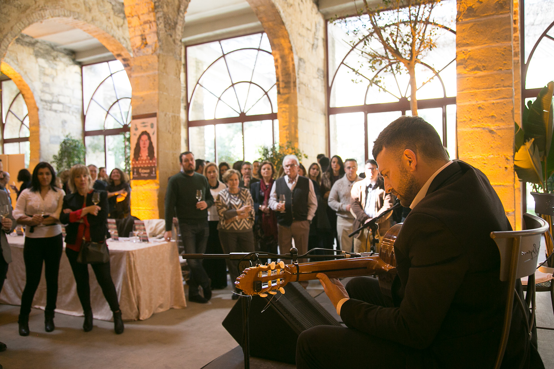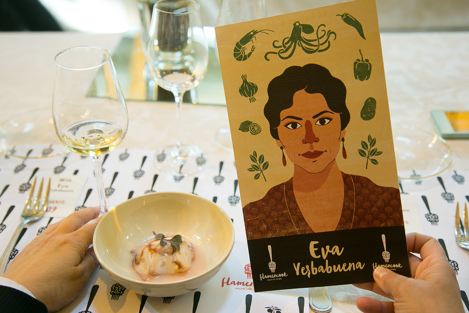 La cita se enmarcó en las instalaciones de la bodega Los Gigantes, una espectacular combinación de arcos de piedra con una enorme cristalera lateral en la que sin embargo destacaron las ilustraciones de los diez artistas flamencos elegidos para esta experiencia, diseñados por Daniel Diosdado, tanto en grandes cartelones colgados de las columnas de la sala como en las cartas dispuestas en las diferentes mesas que explicaban los platos, sus autores y los vinos con los que se maridaban.