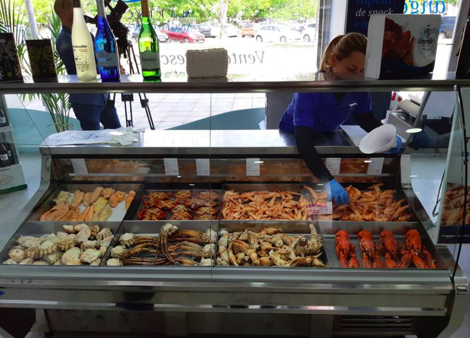Diferentes expositores muestran los diferentes mariscos (gambas, cigalas, bogavantes, langostinos…) congelados, que se cuecen al instante en el cocedero situado en la planta alta de las instalaciones. Llama la atención el peculiar sistema que se usa aquí, un “ascensor marisquero” por el que se eleva el marisco elegido, bajando en apenas unos minutos ya cocido y listo para su consumo. En las instalaciones también hay un gran surtido de conservas y salazones, tanto de la provincia —predominando las de Barbate— como de Galicia.