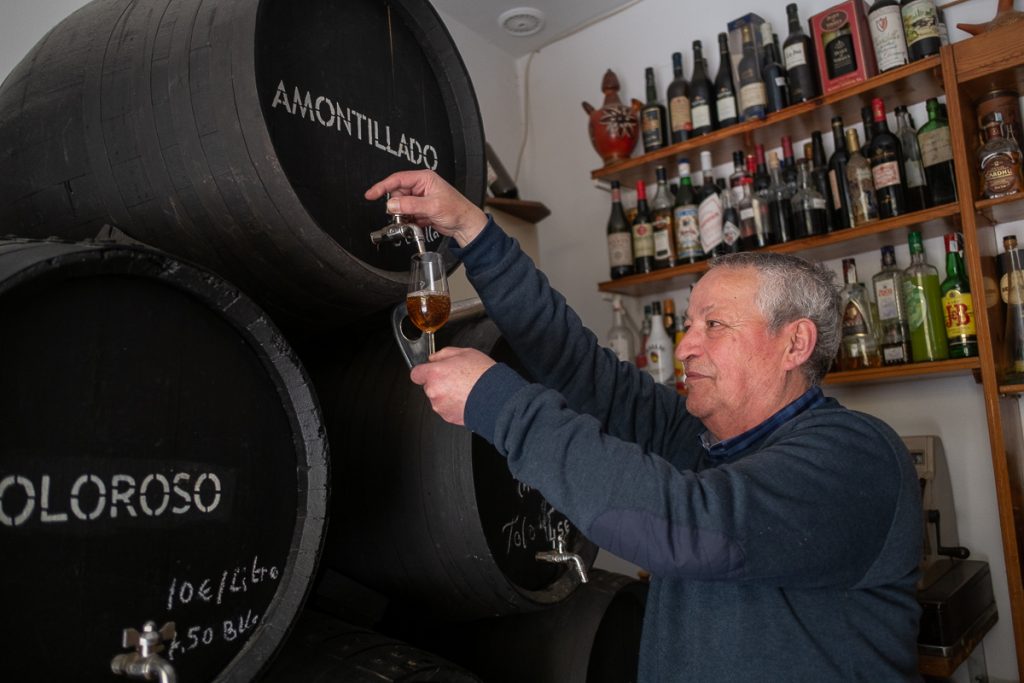 Domingo Ramírez sirviendo una copa de amontillado de la bota del Tabanco Mariñíguez. FOTO: MANU GARCÍA."Teníamos que arriesgarnos y nos embarcamos en esta aventura", dice Ana, que es la cocinera de un establecimiento que frecuentan en petit comité hasta otros hosteleros de la ciudad. La combinación de tabanco y vino de Jerez más cocina clásica andaluza funcionó. "Todo lo que hacemos aquí es casero y la gente lo que viene buscando es ese tipo de comida tradicional", comenta Ana. Con su característico humor, Ana sirve un mix de croquetas, a elegir entre pucherete, espárragos, boletus, chicharrones, queso y tagarninas: "¿A qué están buenas? Coge un piquito que están muy buenos". Domingo apunta: "El secreto está en la bechamel".