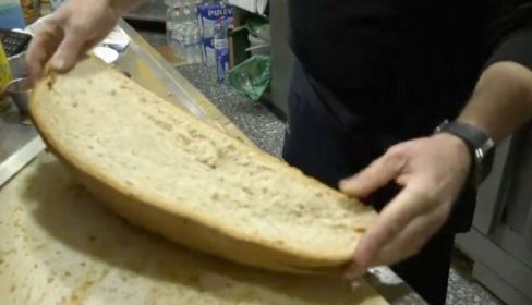 El pan que ofrecen llega desde la panadería Santo Tomás de Naveros, situada en una pedanía de Vejer. Cortado en rebanadas impresionantes, uno de los trabajadores confiesa que hay clientes que incluso se piden dos.