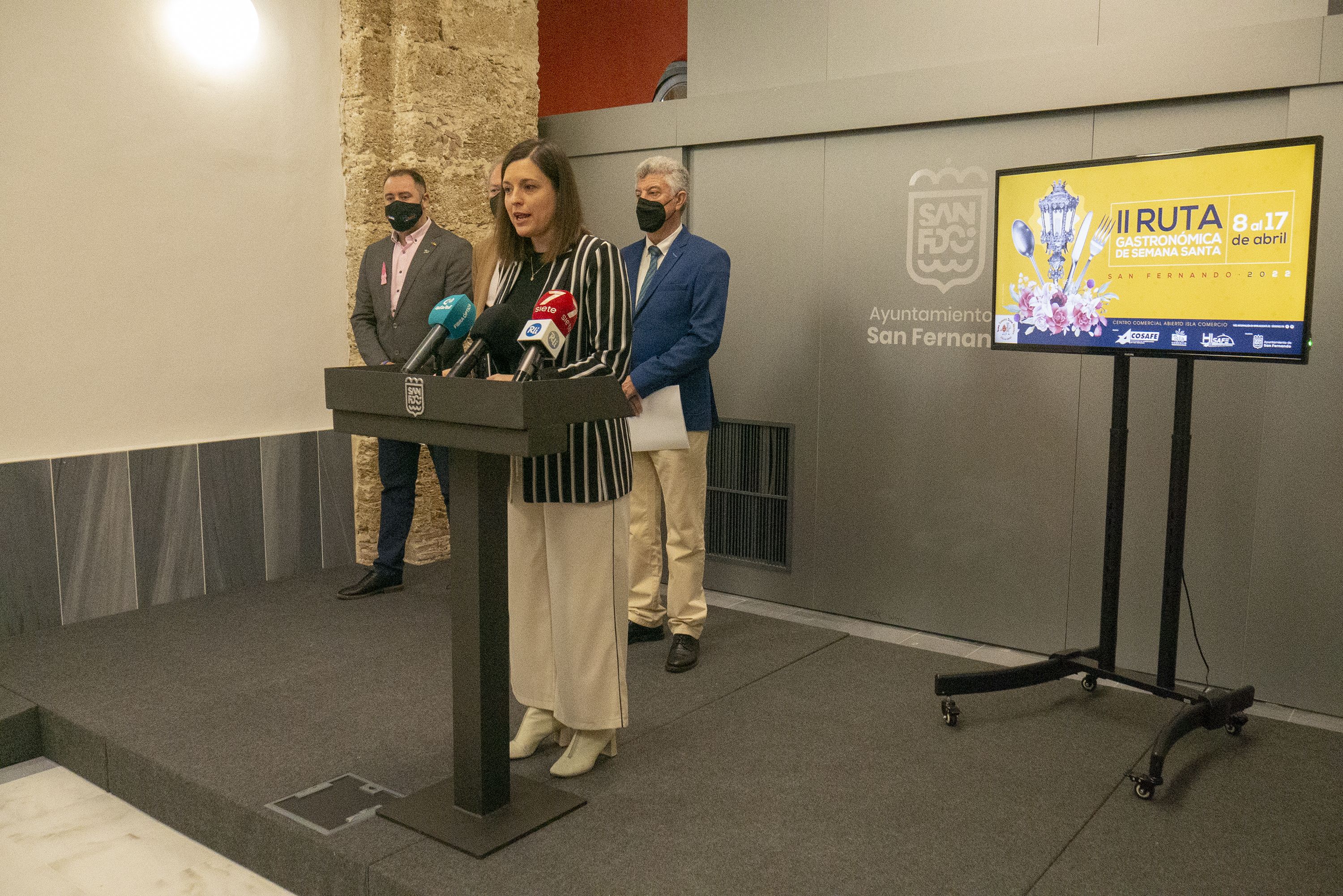 La alcaldesa, Patricia Cavada, acompañada del presidente de la Asociación de Comerciantes de San Fernando (Acosafe), Manuel Luna, el responsable Hisafe (la sectorial de hostelería de esta asociación), Alfonso García, y el concejal de Comercio, Antonio Rojas, han dado a conocer la II Ruta Gastronómica de Semana Santa 2022 y la Exposición Fotográfica en los Escaparates que pone en marcha esta entidad.