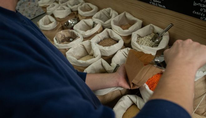 En La Carica los clientes se sirven a sí mismos, cogen una cesta de palma y van añadiendo productos, a granel o envasados, desde frutos secos, fruta deshidratada, semillas, arroces, legumbres o azúcar de caña, aunque lo que más vende Camacho es fruta y verdura. “He tenido que aprender a base de leer y de ir aprendiendo sobre la marcha”, cuenta Carlos, quien comenta entre risas que ahora tiene “un máster” en agroecología.
