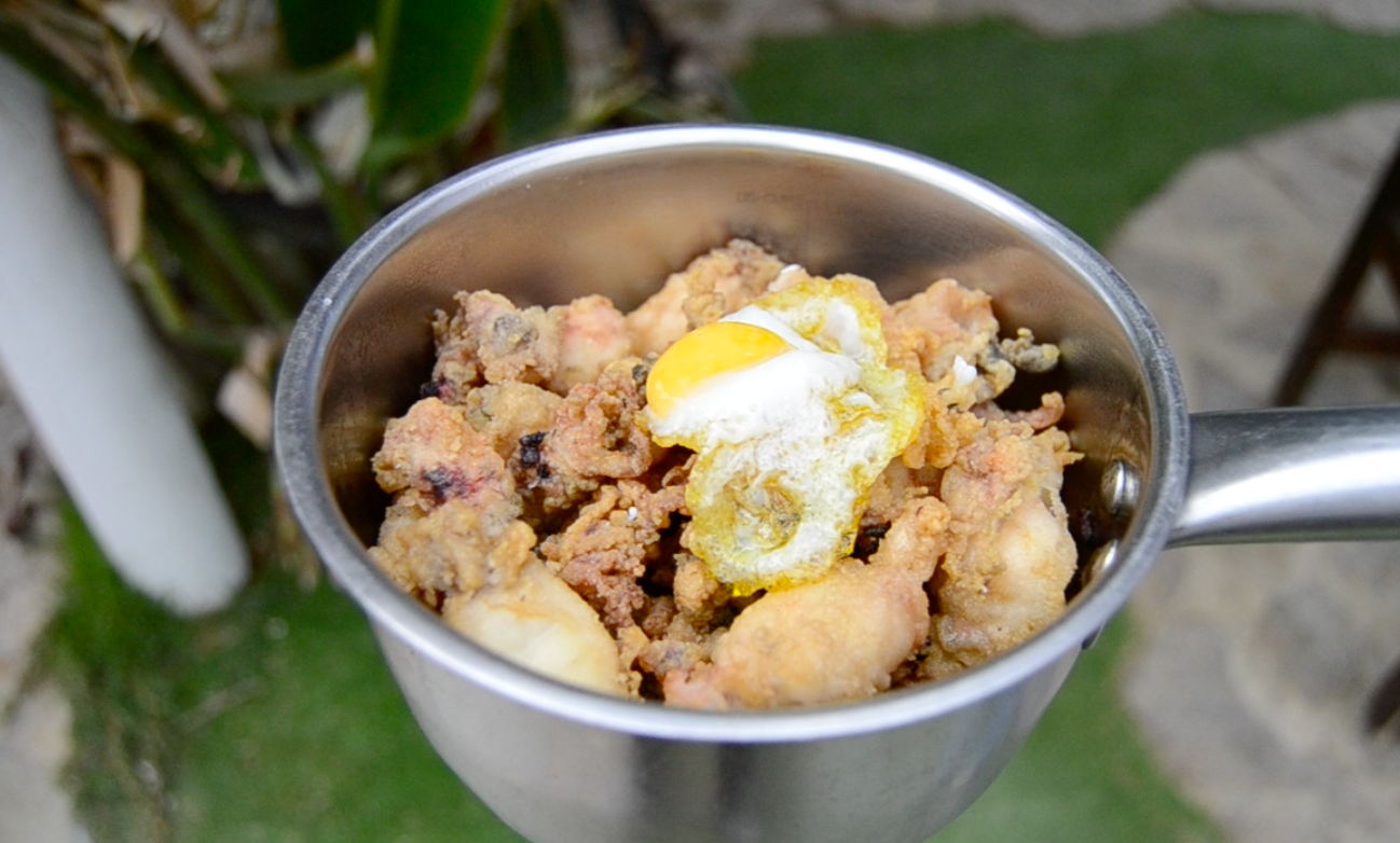 Fantásticas las ortiguillas que les acaban de llevar esa mañana, como también el atún empanado con kikos de Mr. Corn y cuyas piezas han estado 24 horas maceradas en moscatel, vinagre de Jerez y especias; el triángulo relleno de pollo y curry y, por supuesto, el arroz prohibido.